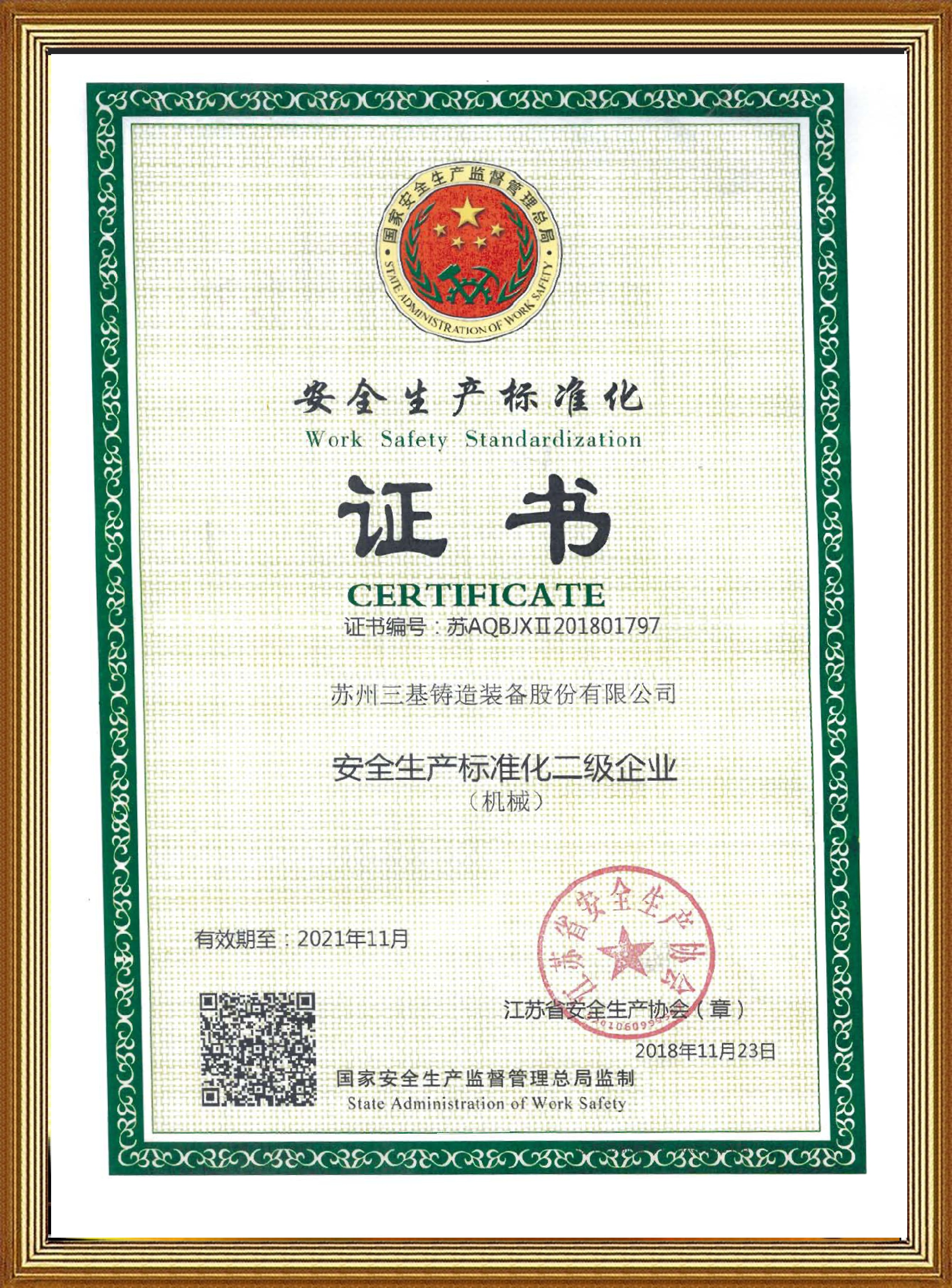 江蘇省安全生產(chǎn)協(xié)會專家組通過對蘇州三基鑄造裝備股份有限公司的安全生產(chǎn)標準化管理資料進行審查、現(xiàn)場考察和評估,于2018年11月23日正式認定公司為省級安全生產(chǎn)標準化二級企業(yè),并頒發(fā)了證書。